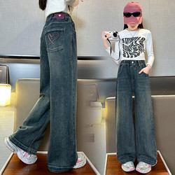2025年春新作女子ジーンズ子供用ハイウエストストレートワイドレッグパンツカジュアルプリントデコレーションルーズフィットデニムビッグガールズ用